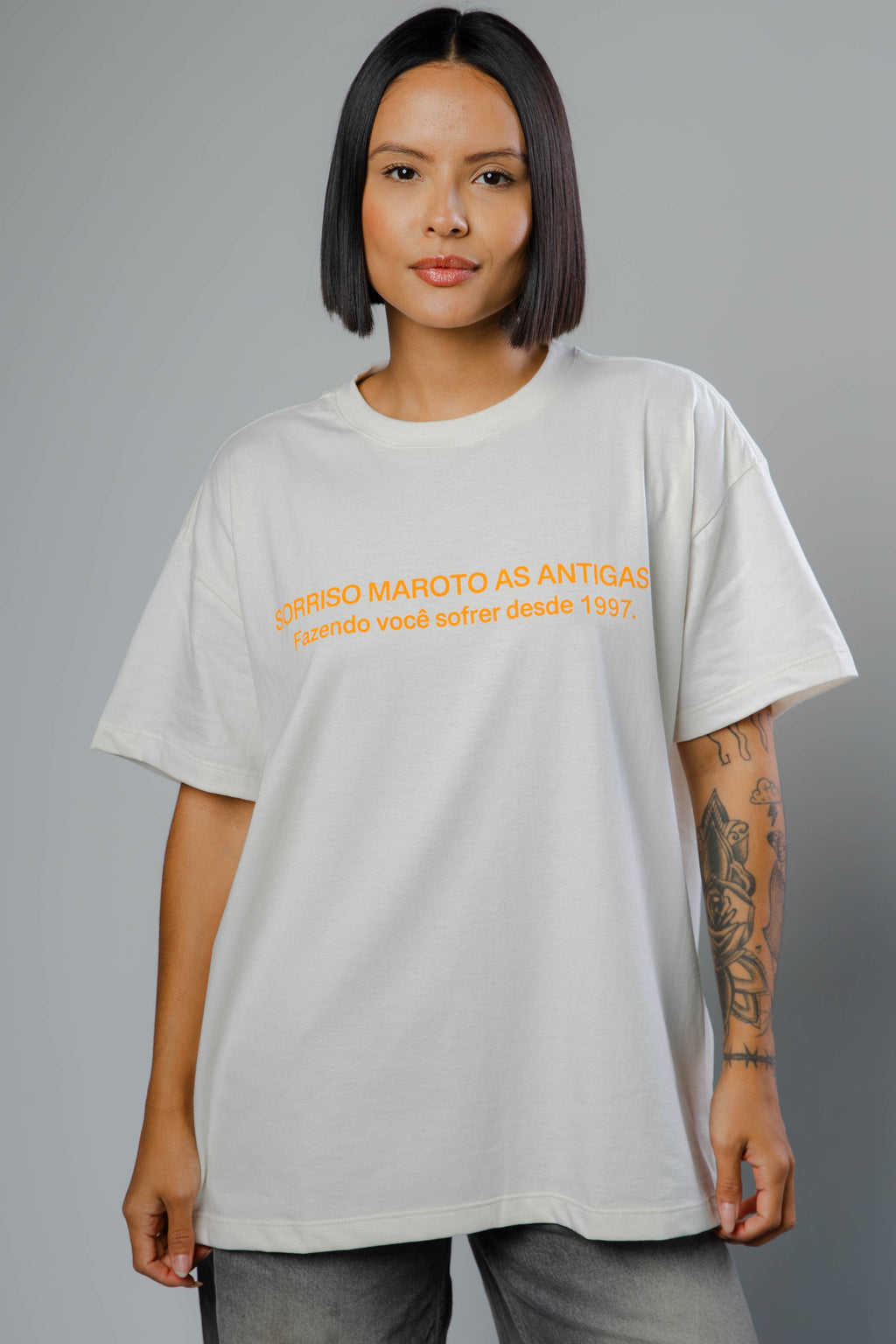 Na parte frontal, o visual é clean, com a assinatura “Sorriso Maroto As Antigas” em contraste, trazendo equilíbrio entre minimalismo e identidade.